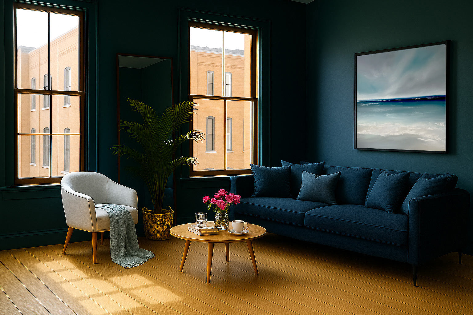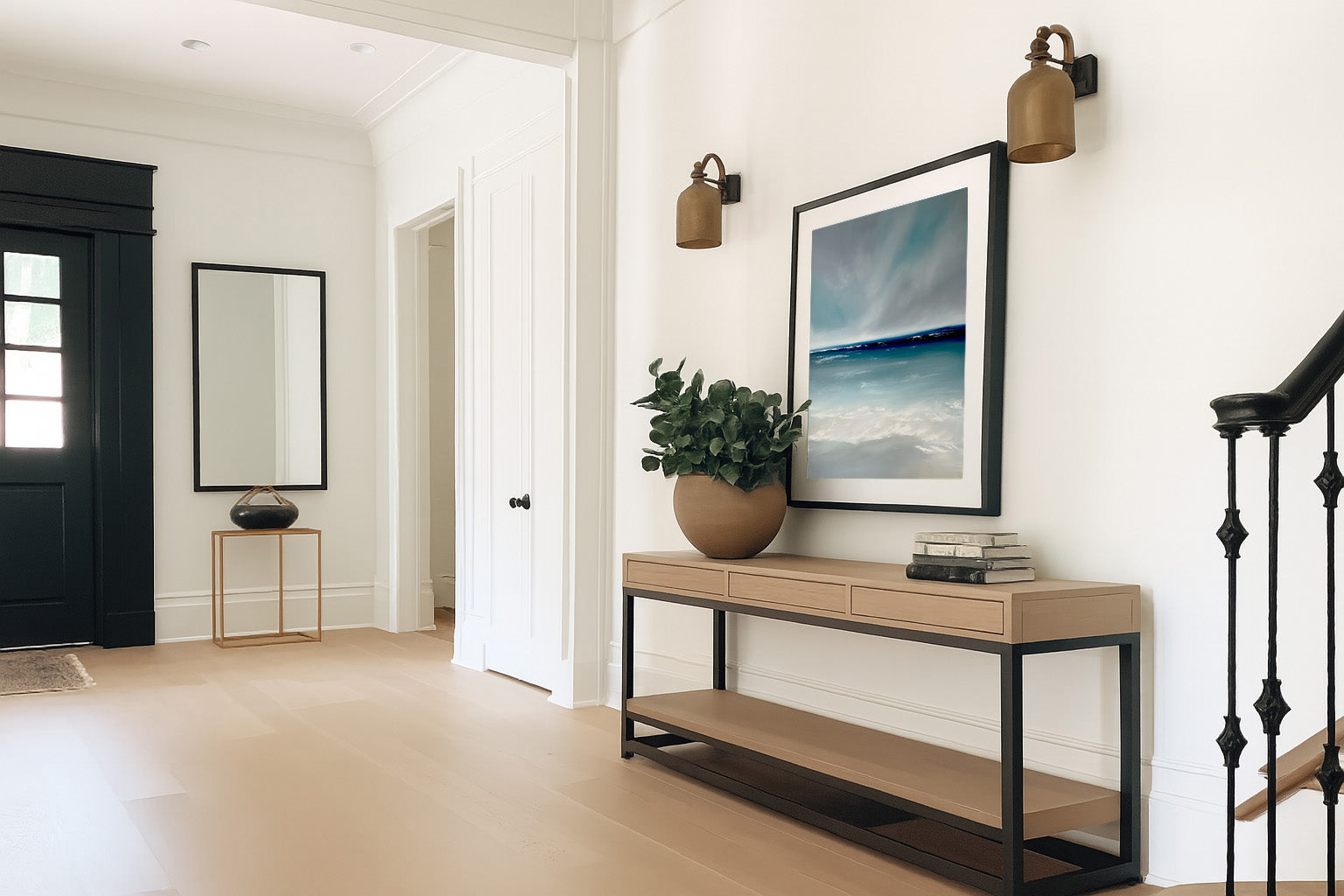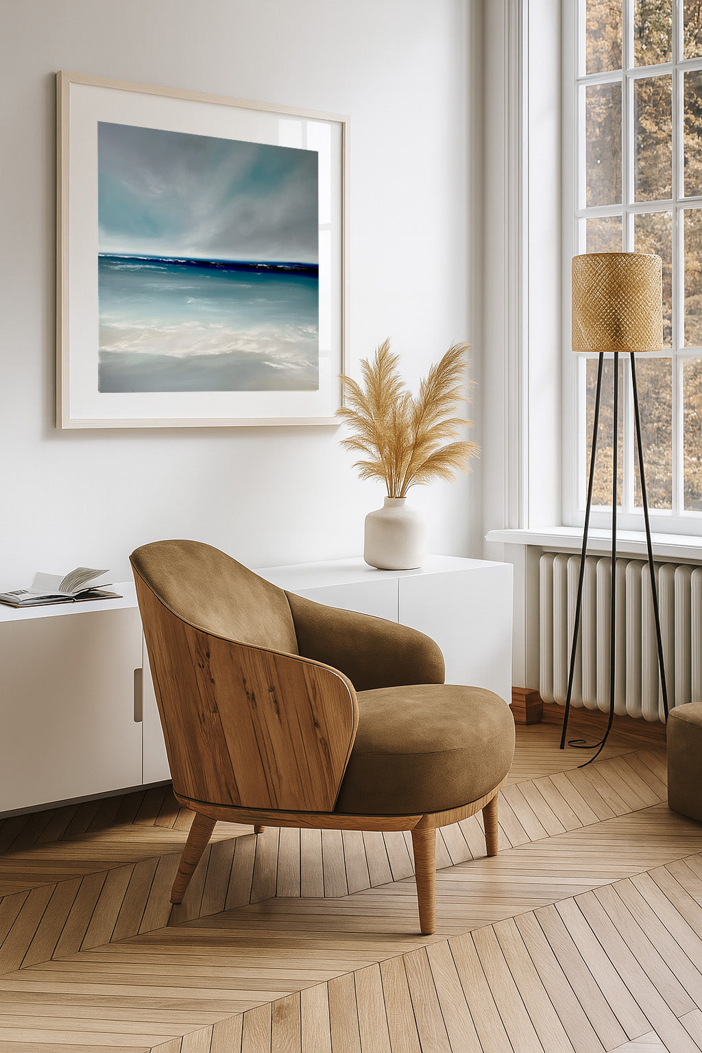 Painted in oils on canvas and layered with soft glazes, the piece captures the movement and luminosity of water in motion. Its palette—gentle blues, subtle neutrals, and glimmers of light—offers a calming yet powerful presence, making it an ideal centerpiece for design-led interiors seeking emotional depth and coastal elegance.
