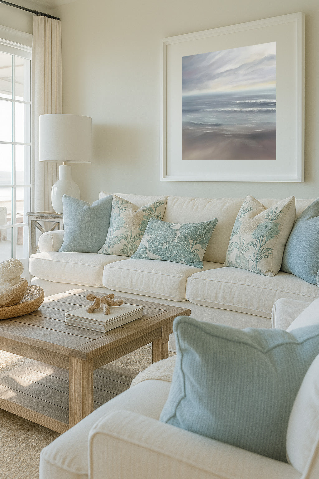 The palette is serene yet soulful—coastal blues and soft neutrals that evoke emotional ease and quiet celebration. It’s a visual affirmation, designed to bring warmth, depth, and a sense of possibility into design-led interiors.