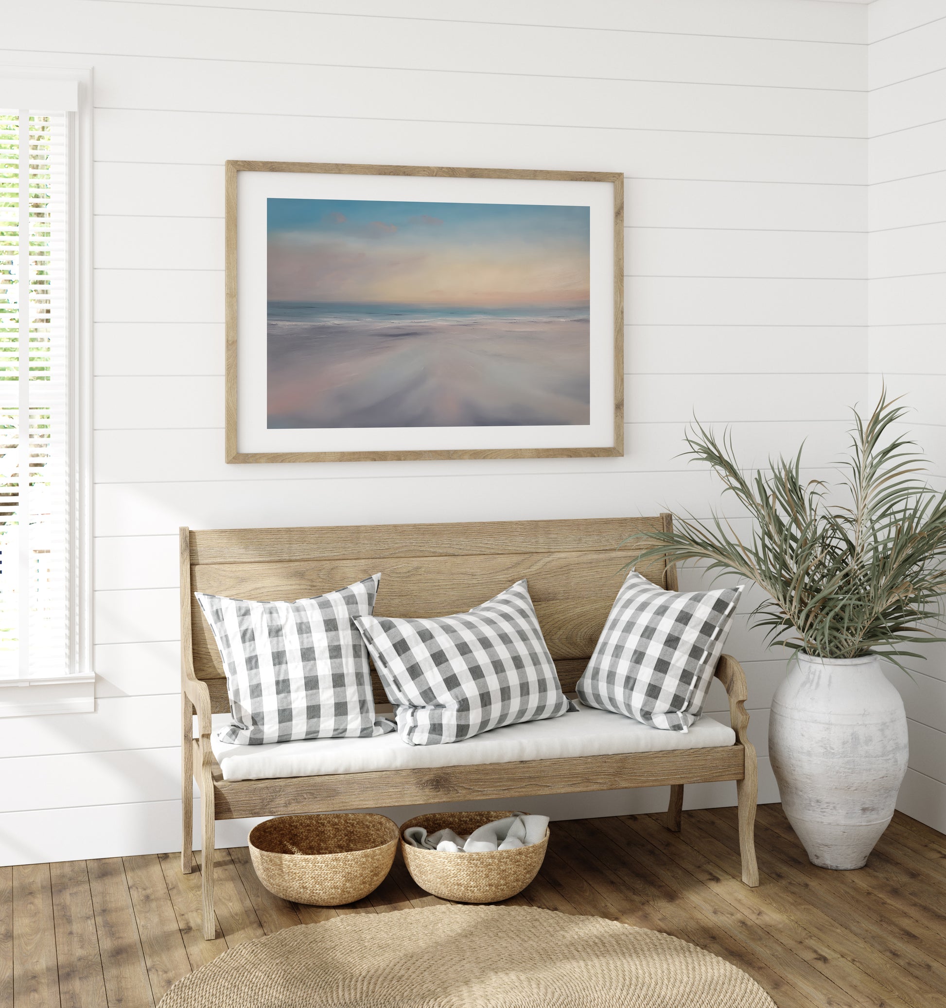 Painted in luminous layers of oil, this contemporary coastal artwork evokes clarity and calm through its soft palette and flowing composition. It’s designed to infuse design-led interiors with lightness, warmth, and emotional stillness.